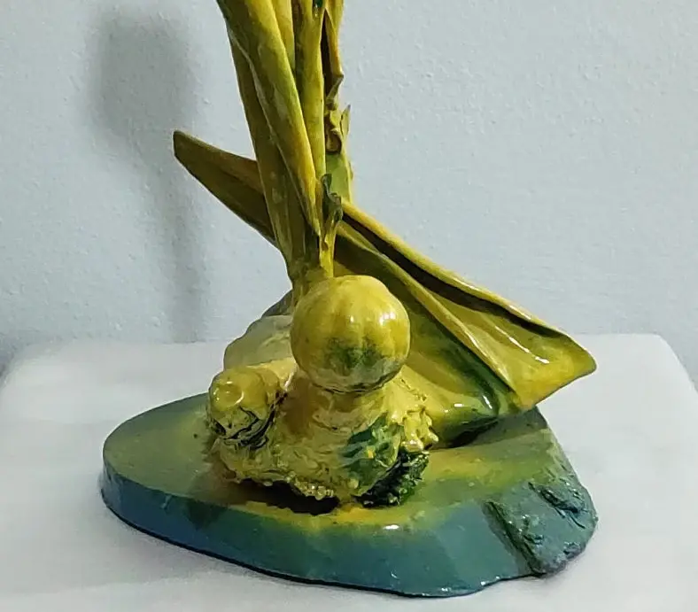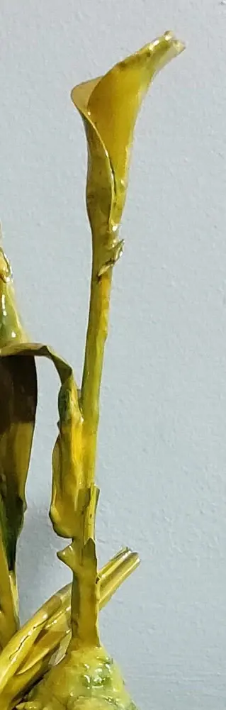 Questa splendida opera d'arte è composta da mini calle e foglie realizzati in resina e materiali compositi, dipinti in un vivace colore giallo-verde che li rende simili a quelli veri. Ogni foglia e fiore è dettagliato e riflette un alto livello di artigianalità, rendendo ogni pezzo unico. L'opera è posizionata su una base in legno, che ne evidenzia la delicatezza e la precisione. Questo articolo è ideale per coloro che cercano di aggiungere un tocco di eleganza naturale ed eterea ai loro spazi. Si tratta di una creazione originale e di qualità, che sicuramente attirerà l'attenzione e i complimenti dei tuoi amici.