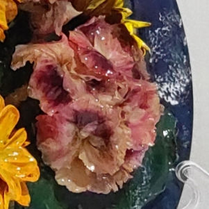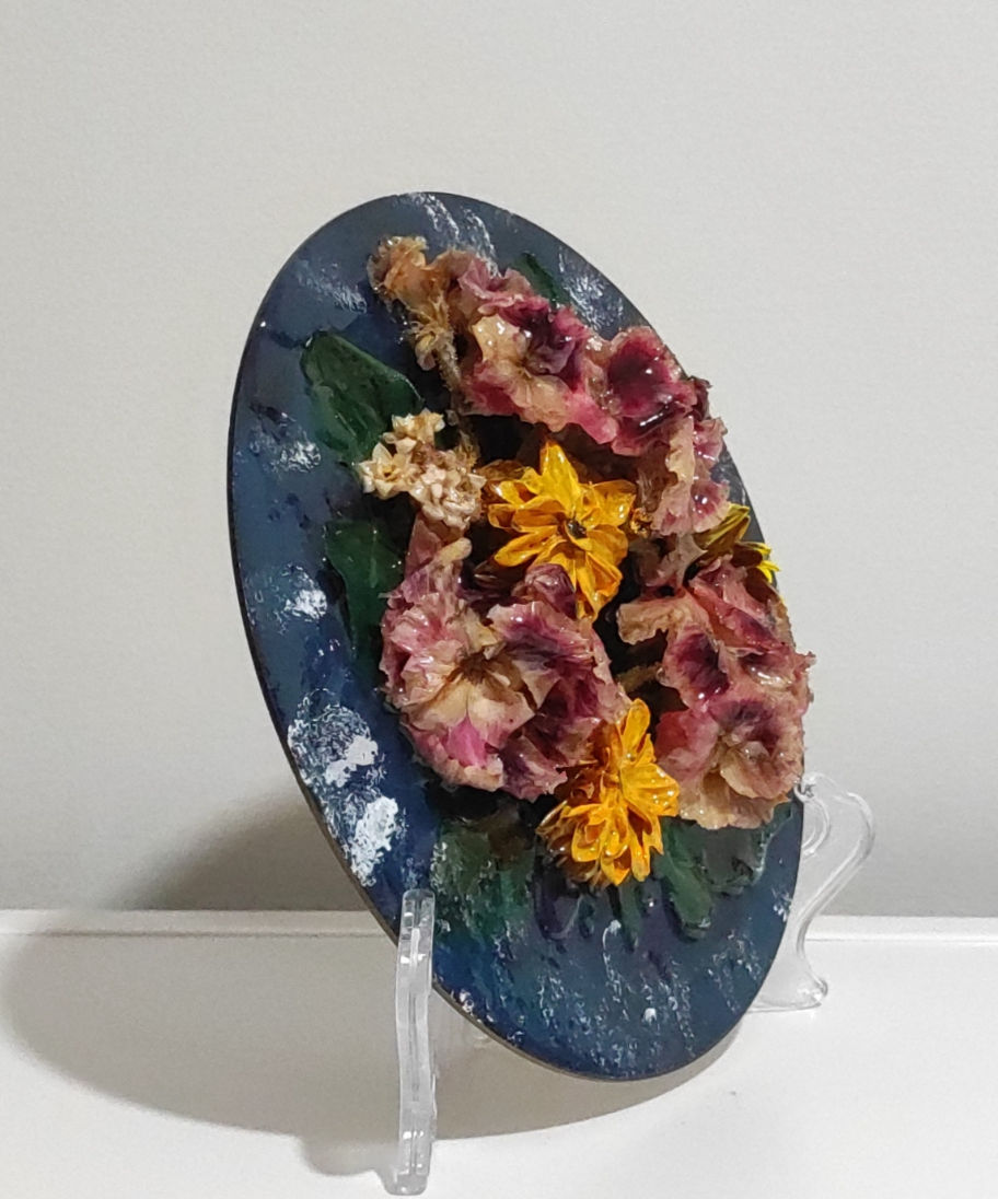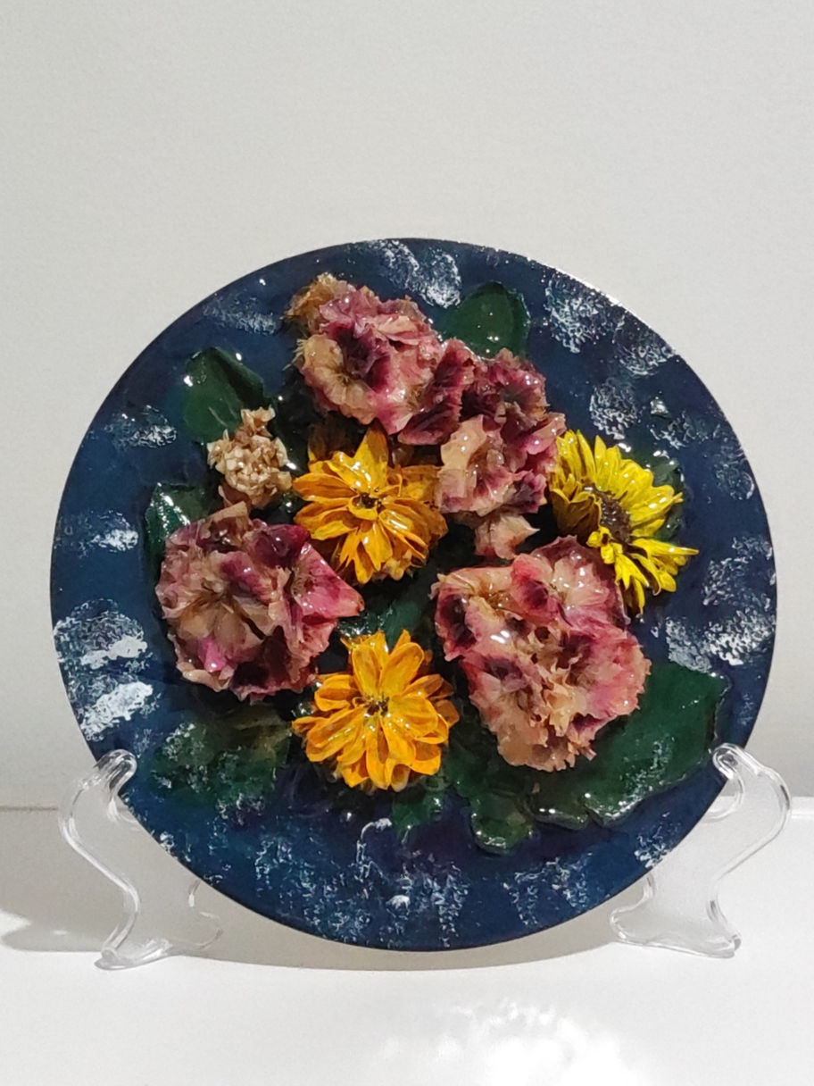 Questo splendido piatto decorativo realizzato su supporto in legno blu cobalto con sfumature bianco(diametro 25 cm) combina la delicatezza della natura con la resistenza di materiali moderni. La composizione include gerani, due piccole dalie e una margherita, tutti eseguiti con una tecnica mista che utilizza resina e materiali compositi. La finitura conferisce un effetto simile alla ceramica e al vetro, dando un tocco di eleganza e raffinatezza. Ideale per chi desidera aggiungere un elemento di design unico e naturale agli ambienti della propria casa o ufficio. Ogni pezzo è un’opera d’arte unica, realizzata a mano con cura e attenzione ai dettagli.