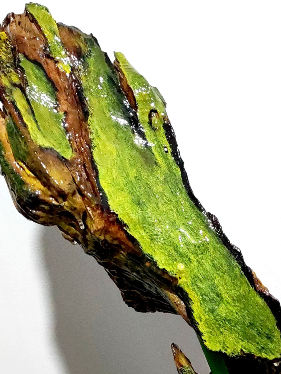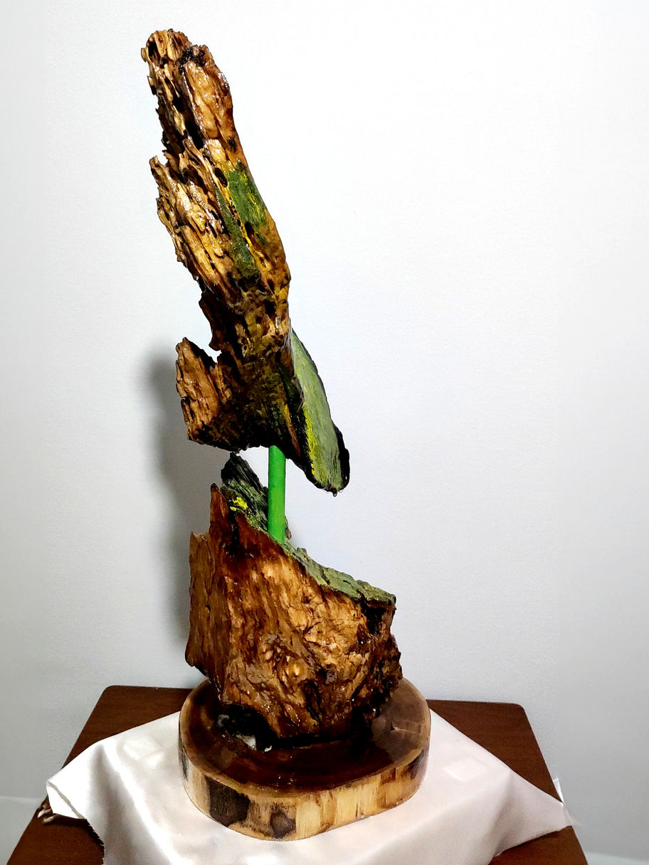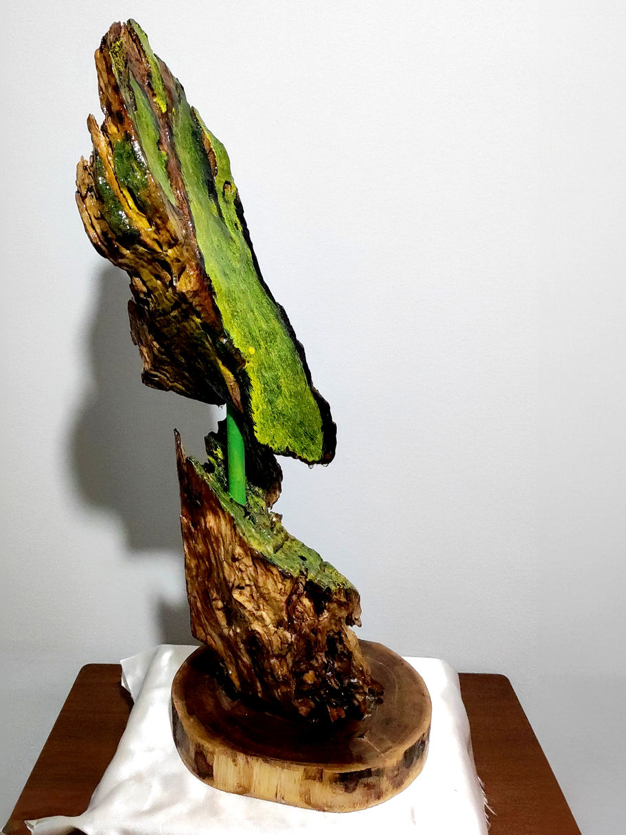 Questa scultura astratta è un vero e proprio tributo all'arte rustica, unendo la semplicità della natura alla maestria artigianale. Realizzata con tronchi accuratamente selezionati, presenta intarsi naturali che, con le loro sfumature di verde, evocano paesaggi boschivi e la magia della natura incontaminata. Ogni dettaglio, ogni striatura, racconta una storia, rendendo l'opera viva e pulsante.